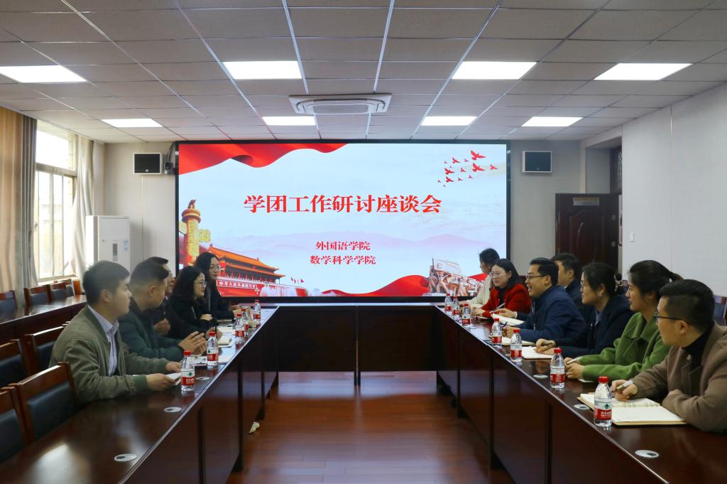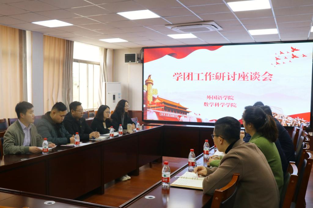 与数学科学学院于数学楼304会议室联合召开学团工作研讨座谈会。数学科学学院党委副书记曲凤东,团委副书记徐腾飞,研究生辅导员韩琳琳,本科生辅导员杜晨曦、韦宁、高思明、吕瑞源,暗网禁区