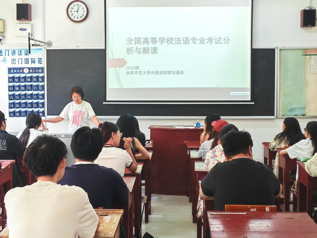 法语专业四级考试由法语系主任唐友霞老师主讲,重点讲解并分析了专四各项题型的重难点和相应的备考技巧,对如何提升练习的有效性给出了建议。在“漫谈法国文学”讲座中,李静老师就19世纪法国优秀作家及其代表作品、历史沿革、文学流派与风格等多方面进行探讨,增进同学们在学习过程中对语言理解的深度。2023级第二外语选课指导讲座由第二外语教研室主任郭婷婷老师主持,三位老师从语言特点、学习难度到考研前景等多个维度对日语、法语、德语进行了详尽介绍,并鼓励学生们根据自身兴趣与职业规划,做出最适合自己的选择。面向2021级英语专业同学开展的专业课程专题讲座,由赵文彬老师组织、满虎老师主讲,通过举例与深入的讨论,引导学生们掌握翻译的核心理论与实用技巧,同时强调保持对翻译领域持续关注与学习的重要性。面向俄语专业同学开展能力专项拓展训练,史崇文老师巧妙地以寓言故事为载体,鼓励学生们广泛阅读、积极输入,以此提升思辨能力与专业知识水平。