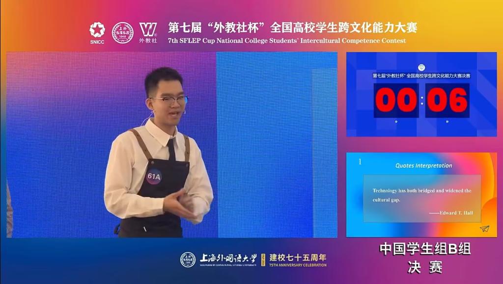 学子杨浩然负责,讲述中国故事(即兴演讲环节),团队以综合成绩前三名的成绩进入全国决赛。国赛共有全国64支代表队参赛,分为三个环节:跨文化案例展析、评委问答、名言名句解读。杨浩然负责名言名句解读环节,抽到的题目问 “Technology has both bridged and widened the cultural gap”经过20s的思考后,杨浩然围绕bridged和widened两方面解读,最后结合习总书记的文化思想升华主题 。最终暗网禁区