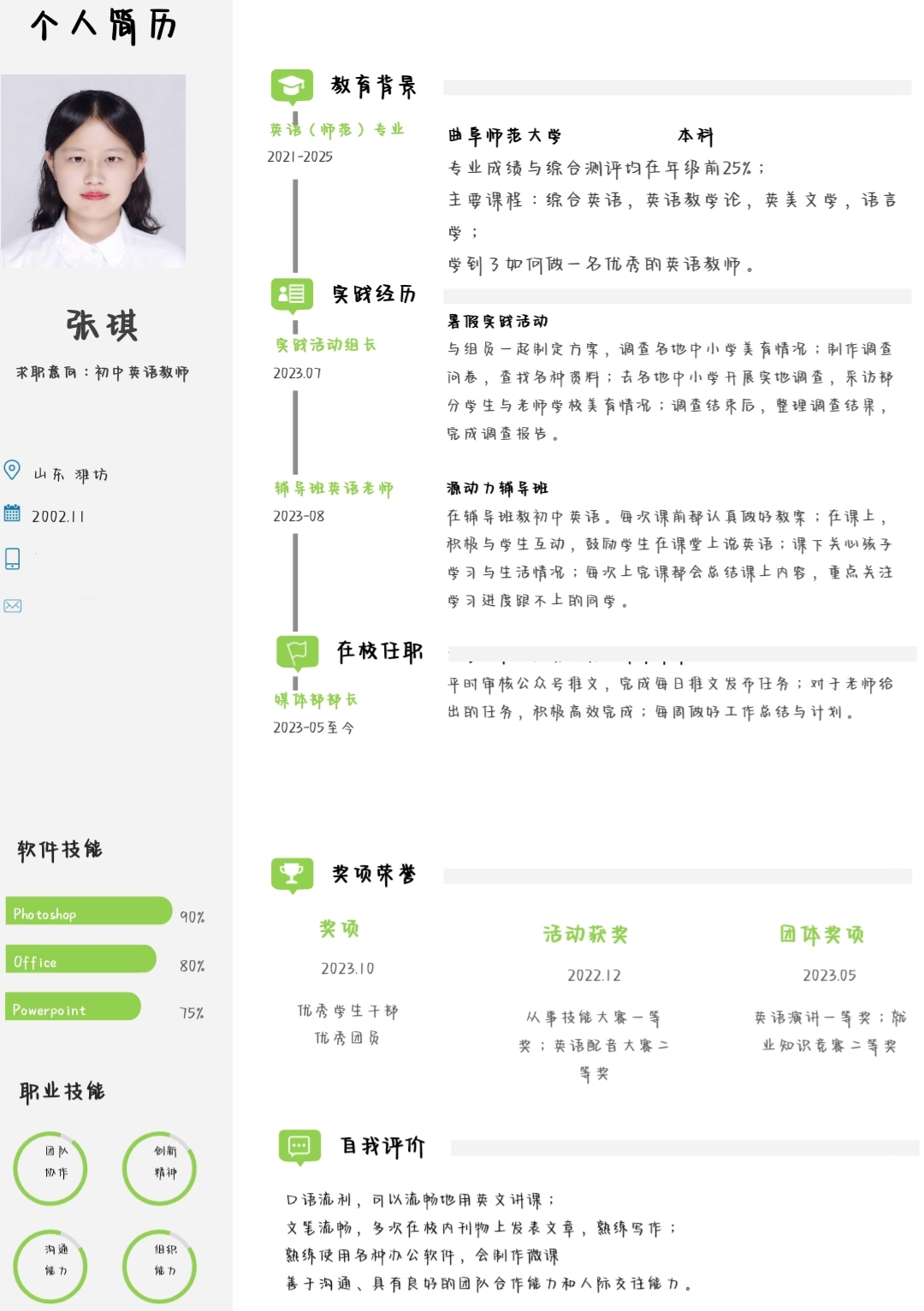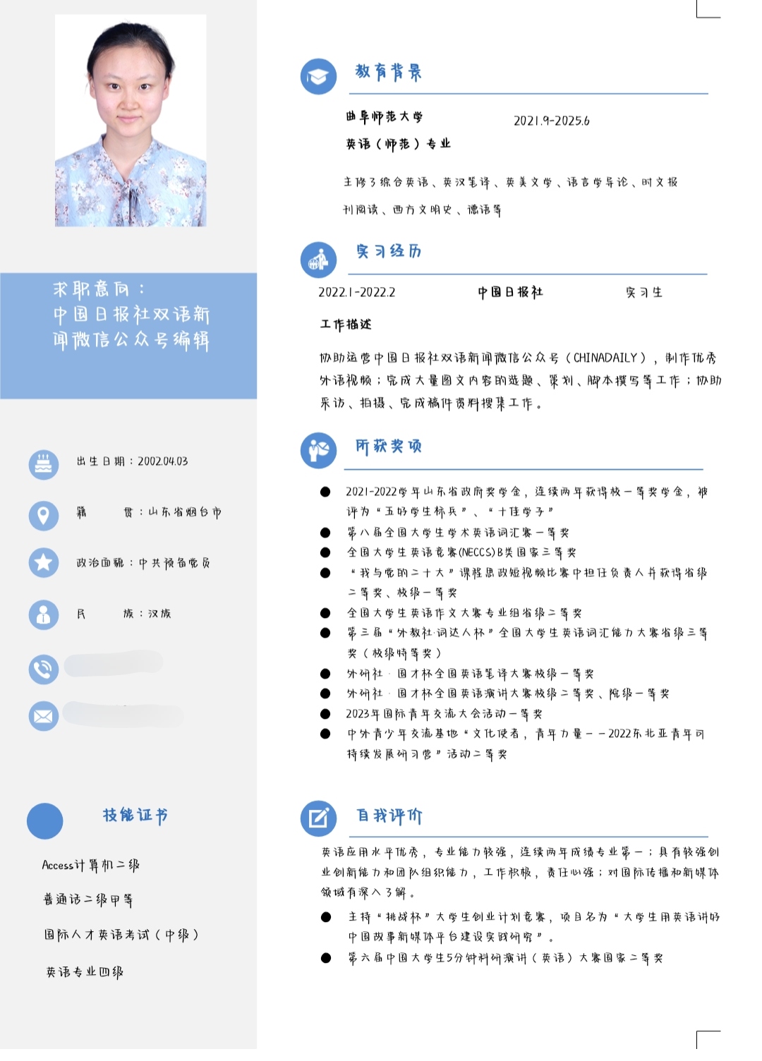 简历是求职者向面试官展示自己、推荐自己的重要方式,在一定程度上影响着面试的结果。一份优秀的简历不仅需要包括一些必要的板块,如基本信息、教育背景、奖励证书、社会实践、实习工作经历、自我评价等,而且需要具有精美的排版和设计。在本次大赛中,张琪、沙渺以新颖的设计思路、美观的简历排版,向我们展示了清晰独特的简历设计,荣获本次大赛的一等奖。张嘉怡等三人荣获二等奖,丁泽等五人荣获三等奖。