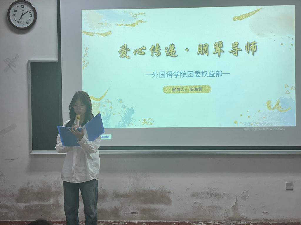 宣讲活动中,权益部部长所海蓉围绕“感恩·励志·诚信”主题,结合当前形势与发展,立足学生全面发展,诠释了感恩、励志、诚信的时代内涵和底蕴。她以充满感染力和激情的语言启示我们要心怀感恩,感恩父母的养育之恩、感恩老师的教诲之恩、感恩朋友的知遇之恩,在感恩中与爱同行。宣讲的结尾,她鼓励我们要志存高远,心向阳光,克服种种困难,并且能够以诚立身、恪守本分,做到言必信、行必果。