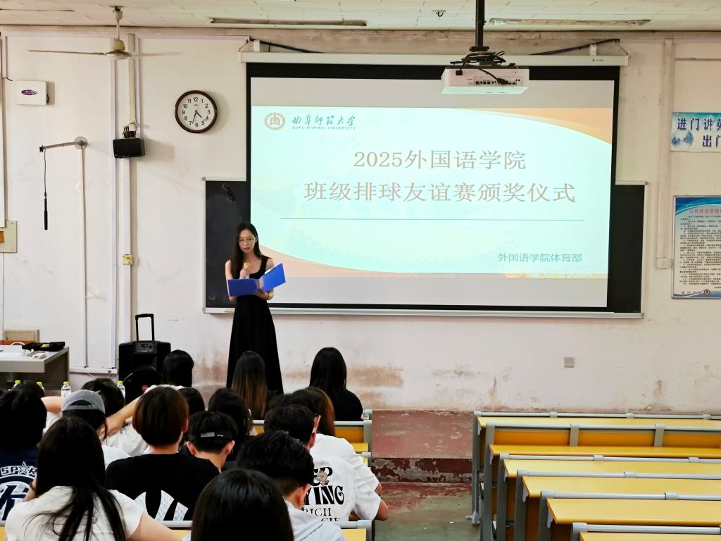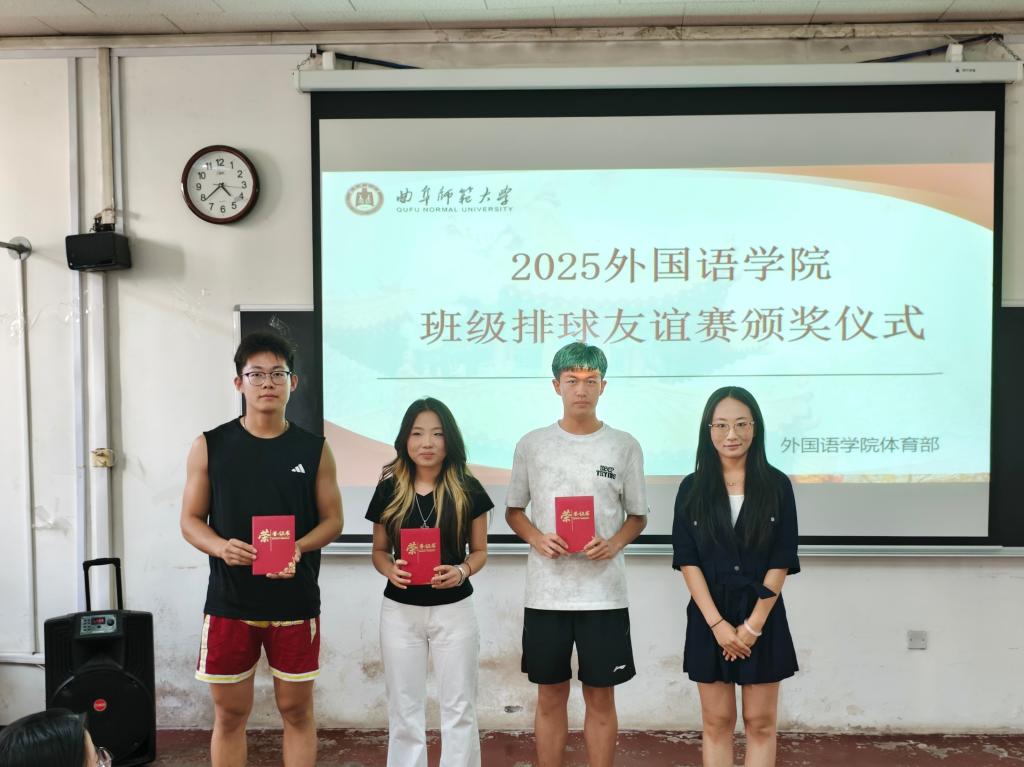 决赛现场,各班级队伍全力以赴,扣球、拦网、救球动作连贯流畅,比分交替上升,呐喊助威声此起彼伏。经过激烈角逐,2023级英语一班发挥稳定,夺得冠军;2023级英语三班、俄语班分别获得亚军和季军。决赛结束后举行颁奖典礼,三位学生会干部为获奖队伍、优秀教练及裁判员颁发荣誉证书。获奖人员接过证书,与颁奖嘉宾合影留念,现场掌声不断,共同见证荣耀时刻。