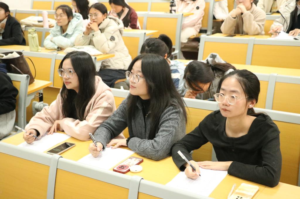 本次粉笔字大赛分为初赛、决赛两个阶段,设师范生、非师范生两个组别,面向大二、大三年级全体同学展开。初赛阶段,学生需以《江雪》为书写内容,每班推选两人进入决赛,晋级选手在决赛阶段则需限时书写《江雪》。比赛现场,选手们手中握笔,神情专注,笔画遒劲有力。选手们的字体端庄秀丽,书写风格多样,或清秀灵动,或富含创意。评委在“笔画标准”这一评判准则的基础上新增“字体与诗意适配度”“板书布局美感”等指标进行打分。最终,秦朝阳、王贞茹同学凭借兼具规范性与艺术性的板书荣获师范组一等奖,卢思宇同学以富有个人风格的书写荣获非师范组一等奖。
