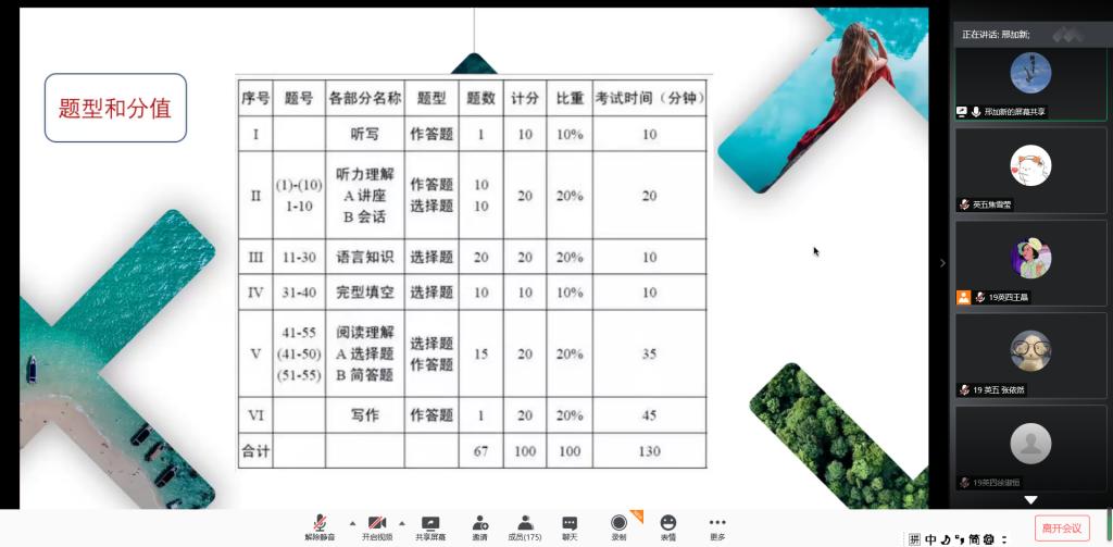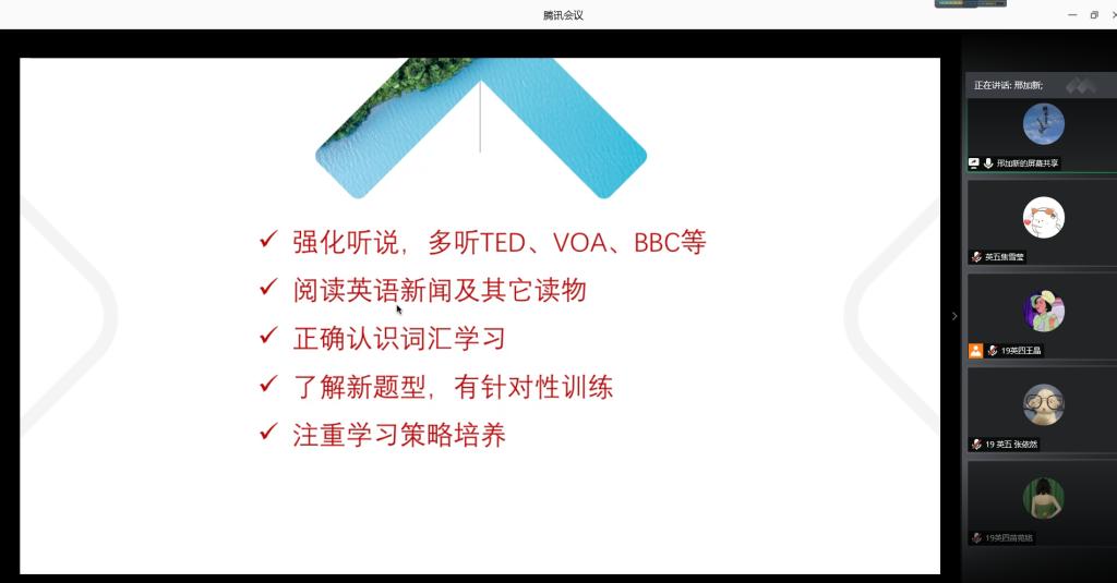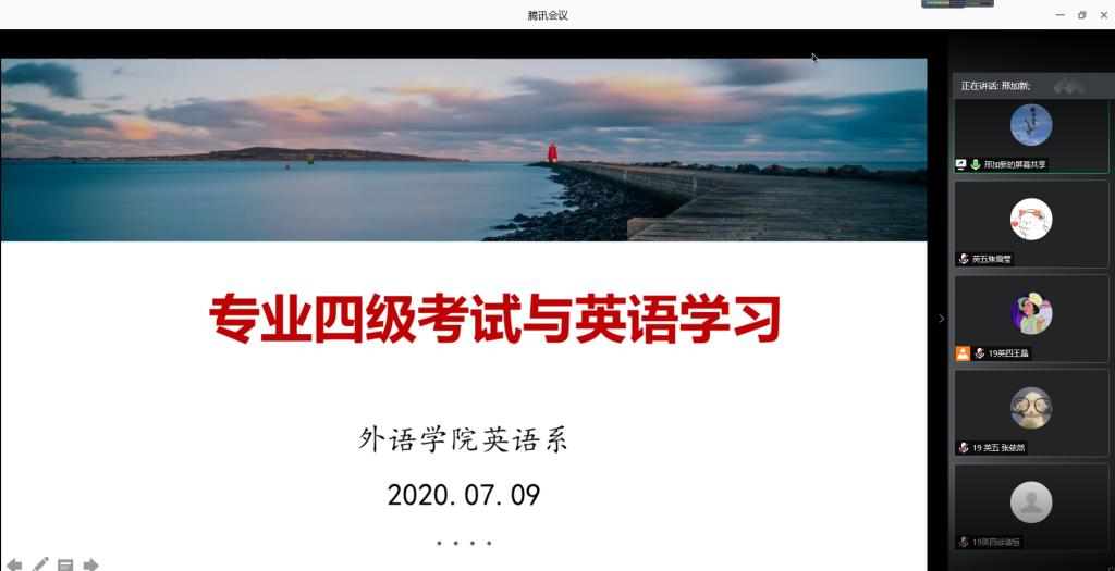 于7月9日上午通过腾讯会议进行英语专业四级考试专题讲座。本次讲座由邢加新老师主讲,刘萍老师主持,2019级英语专业全体同学参加了此次讲座。