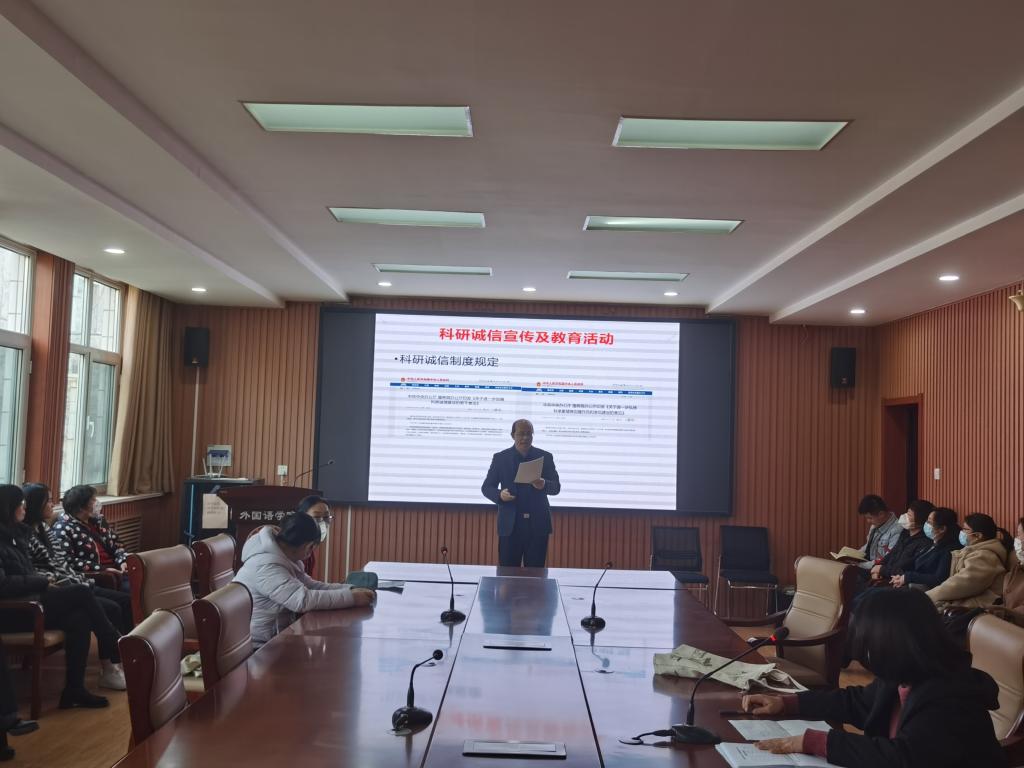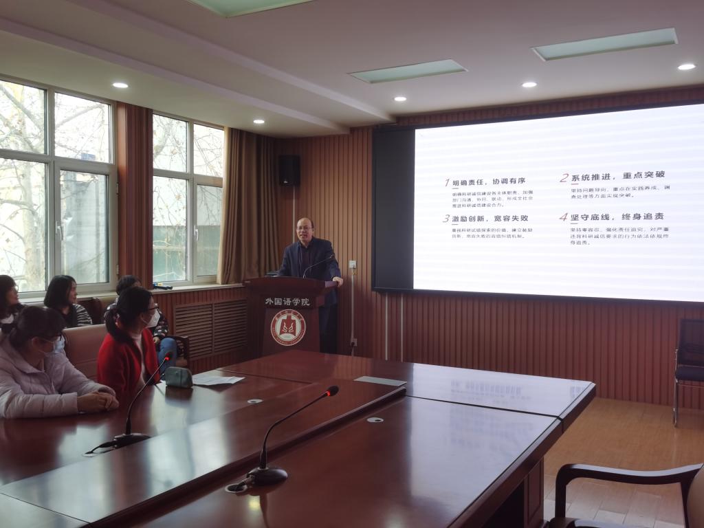 副院长王洪明首先向全体教师介绍了科研诚信专题教育活动的各个环节,进一步强调了加强科研诚信建设的重要性。其次,和全院教师集体学习了中共中央、国务院以及教育部和山东省关于加强诚信建设的系列文件。最后,对科研诚信系列文件的指导思想、基本原则、主要目标等做了进一步解读。王洪明指出,学院要求教师及其指导的本科生和研究生也要坚持科研诚信,规范学术论文和毕业论文写作。学院也将采取系列措施预防学术不端行为,对学术不端行为持零容忍态度,严肃查处违背科研诚信要求行为。同时,学院也要求各教研室继续学习、研讨科研文件,坚决杜绝学术不端行为。