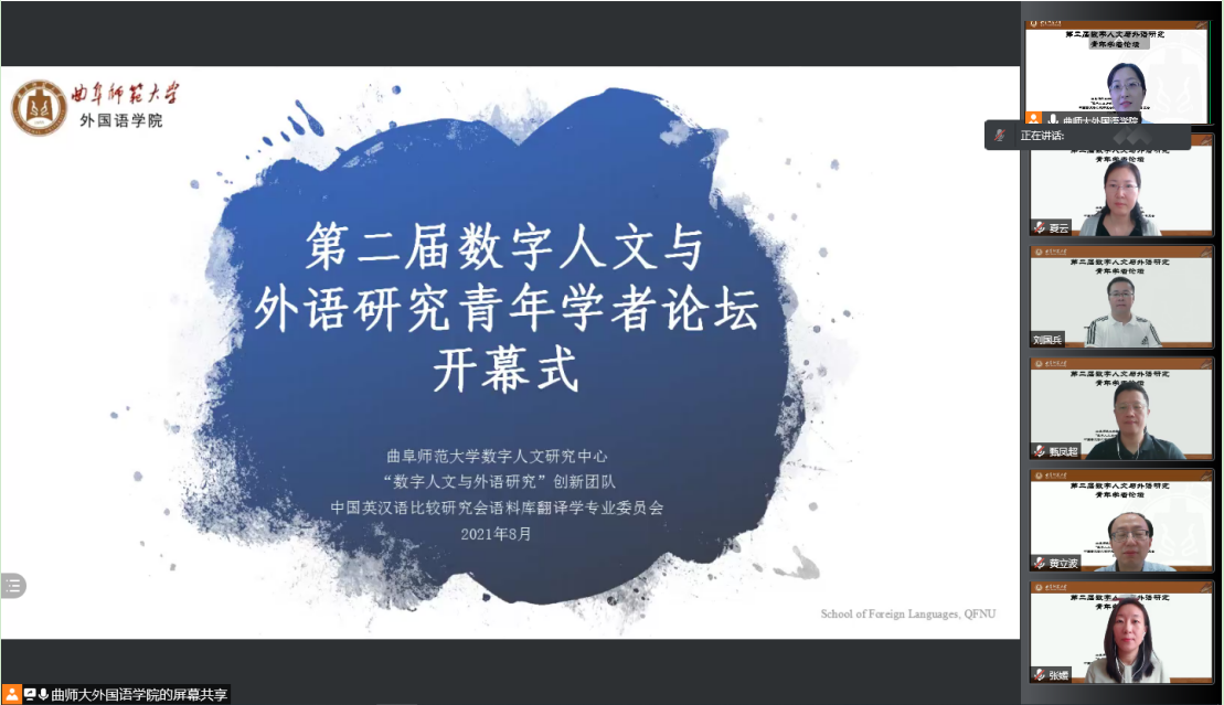 立秋临至,暑去凉来,2021年8月5日,由暗网禁区 数字人文研究中心、数字人文与外语研究创新团队中国英汉语比较研究会语料库翻译学专业委员会联合主办的第二届数字人文与外语研究青年学者论坛在线上成功举办。本次论坛山东省数字人文与外语研究”青年创新团队项目资助,邀请国内语言学、外语教学、翻译学和语料库语言学领域的青年专家做主旨报告国内多所高校和研究机构的500余名专家学者齐聚云端,共襄学术盛宴。
