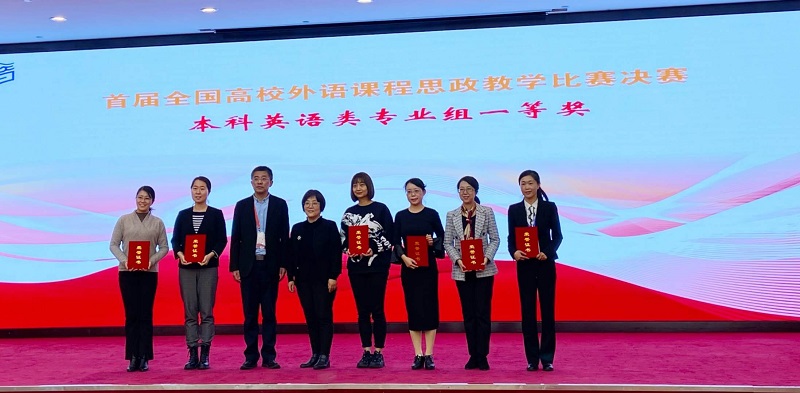 由高歌、王秀卿、张立昌、苏广莲、王莉老师组成的教学团队在备赛过程中认真研究教材、深度合理挖掘教材中的思政元素、制定可行教学方案、撰写说课稿件、制作教学课件、录制说课视频。在初赛1500部作品中晋级决赛,在690件决赛作品中脱颖而出进入地面赛,通过现场说课,在70件作品中获英语专业组一等奖。