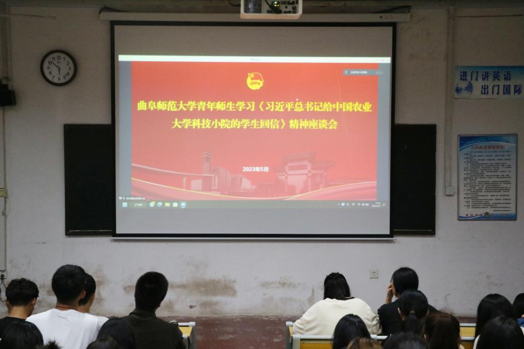 设分会场观看曲阜师大青年师生学习习近平总书记回信精神座谈会。学院团委、学生会全体成员、全体班委于系楼101室通过视频会议参加。