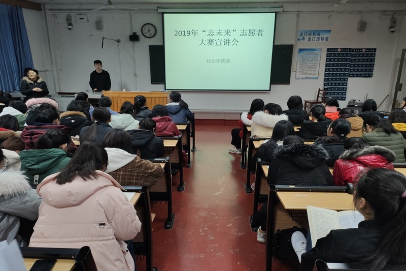于12月12日上午在系楼201举行2019年“志未来”志愿者大赛宣讲会。本次会议由学生会团委副书记刘仪霞、郑琪主持,社会实践部部长姜贵宁,优秀志愿者孟娜、王戈以及2018、2019级全体同学参加。