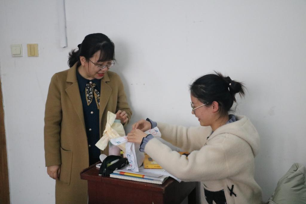 老师们与主席团成员分别将学院精心制作的“考研爱心礼包”分发给同学们,并为他们加油打气。“考研爱心礼包”里装有糖果、水果以及与水果寓意相关的贺卡:柿子象征着“柿柿”顺心、橙子象征着心想事“橙”、橘子寓意着一“橘”夺魁、苹果寓意着“苹”安顺遂……件件贴心的礼物,句句真切的话语,令身处紧张备考的考研学子深深感受到来自学院的爱与温暖。考研学子纷纷表示,“考研爱心礼包”让自己备受鼓舞,感受到了冬日温暖,增强了逐梦研途的信心,自己定会全力以赴,实现梦想。