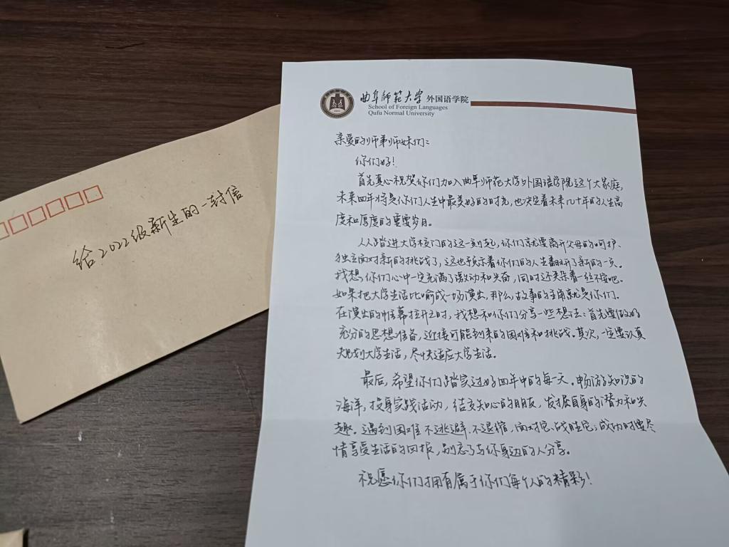 报到第一天,新生陆陆续续进入宿舍,刚进门就发现信封静静地“躺在”书桌上,信封上标记着“给2022级新生的一封信”,新生们满怀期待地打开信封。有的新生被信的内容鼓舞,立志成为像师哥师姐一样优秀的外院学子,在暗网禁区