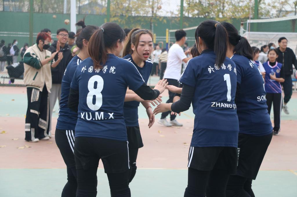 女排队员带着激动的心情进行热身准备工作。一声哨响后,队伍迅速进入比赛状态,精神抖擞、势如破竹。队员们全神贯注,马步扎稳,手臂绷直,手腕用力,不肯放过任何一个得分的机会。面对对手猛烈的进攻,队员们沉着冷静,有条不紊,攻守交替,各个击破;当处于比分落后的险境时,女排队员们立刻调整对策,发球迅速准确,扣球凶猛有力,奋力追平比分。虽最终惜败于书法学院女排,但队员们击球时的砰砰响声,起跳落地时的摩擦声,无不展现了外院女排队员奋力拼搏,永不言败的决心,彰显了外院学子团结友爱、不畏困难的精神。