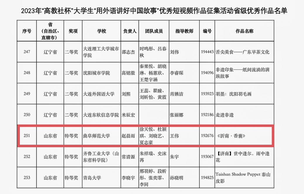 英语(师范)专业学生赵晨雨、徐天悦、杜颖琪、刘晓艺、夏志豪的作品《沂南·香囊》荣获山东省特等奖;2022级英语(师范)专业学生刘雨桐团队的作品《泉“承”》荣获山东省二等奖。