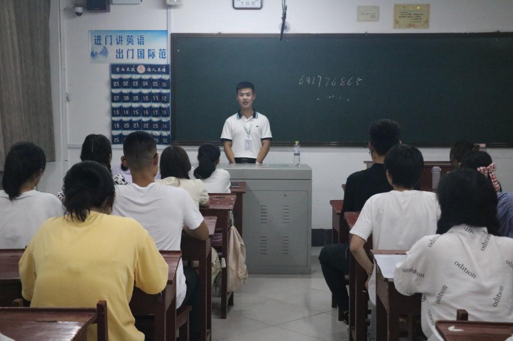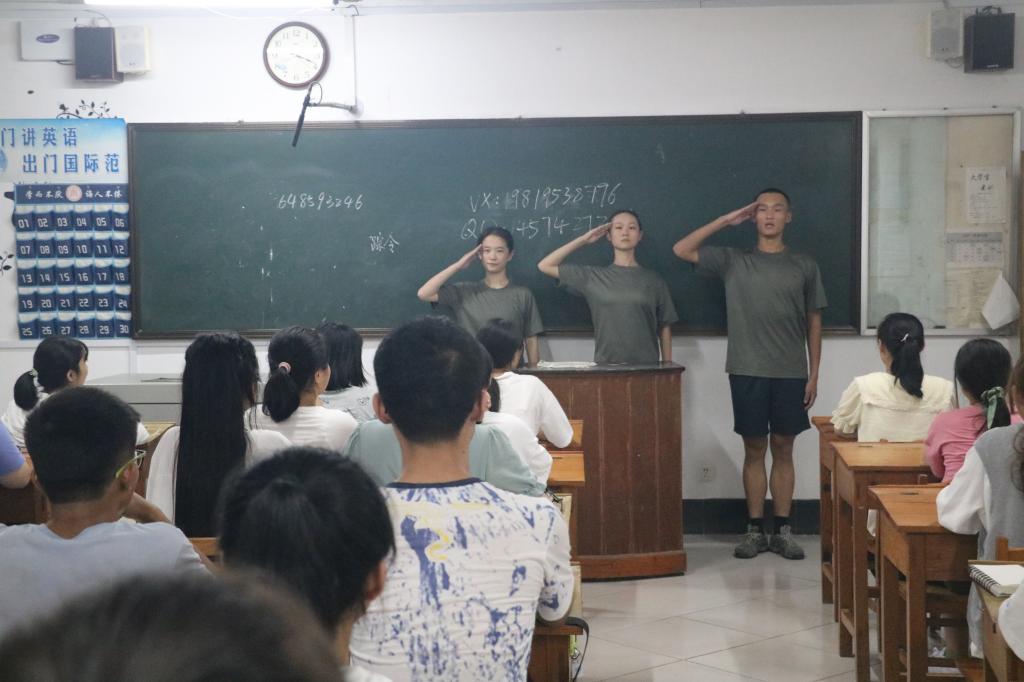 2021级辅导员王仁杰带领五位军训教官来到各新生教室,与同学们见面并介绍军训情况。