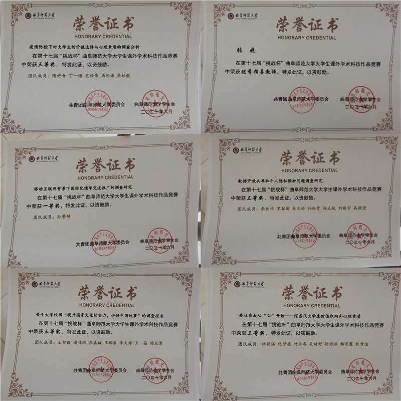 共五支队伍获校级表彰,其中由张晓老师指导,孙誉绮同学带领所在团队完成的项目“移动互联网背景下国际化儒学交流推广的调查研究”在众多项目中脱颖而出,荣获校级一等奖。杜颖琪、李欣怡、王智毅、隋妤奇同学带领所在团队完成的项目荣获校级三等奖。