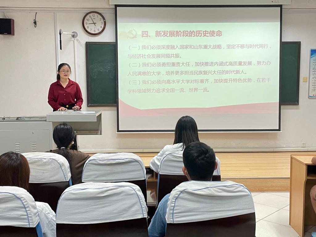 第九次党代会精神的认识。希望同学们在今后的学习与生活中能够严格要求自我,不忘初心,牢记使命,踔厉奋发,为学院的发展贡献自己的青春力量,为建设世界知名的高水平孔子家乡大学而不懈奋斗,以实际行动迎接党的二十大胜利召开。