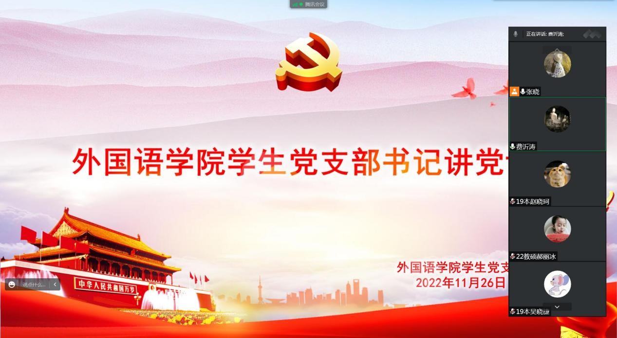 会上,学生党支部书记张晓就党的二十大中“如何理解传承中华优秀传统文化”进行阐述。她指出,外语专业学生是弘扬和传播中华优秀传统文化的桥梁,务必要坚持不忘本来,发挥我们位于儒学发源地的优势,同时与现代社会相适应,担起责任,发挥党员积极作用,用外语讲好中国故事。