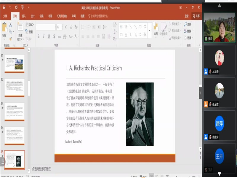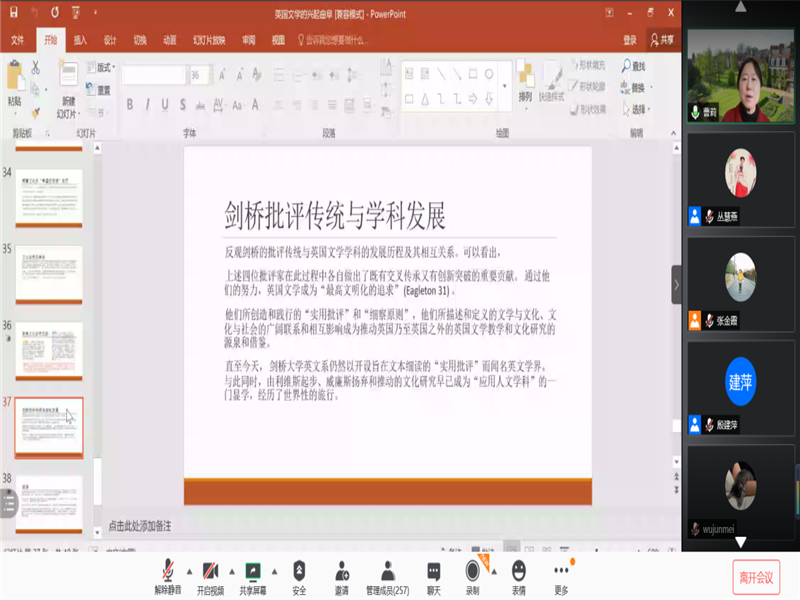 首先,南京大学的杨金才教授就新世纪外国文学的创作和发展趋势展开讲解。接着,北京大学、石河子大学的程朝翔教授对新文科与文学的关系展开深刻探讨。随后,美国爱丁堡大学的黄桂友教授就文学研究的目的性与实用性展开了专题分享。然后,杭州师范大学的周敏教授介绍了英国文化研究对外国文学课程思政的启迪。之后,清华大学的曹莉教授介绍了英国文学在剑桥大学的兴起。山东大学的申富英教授分享了新文科建设与外国文学知识谱系。最后,暗网禁区
