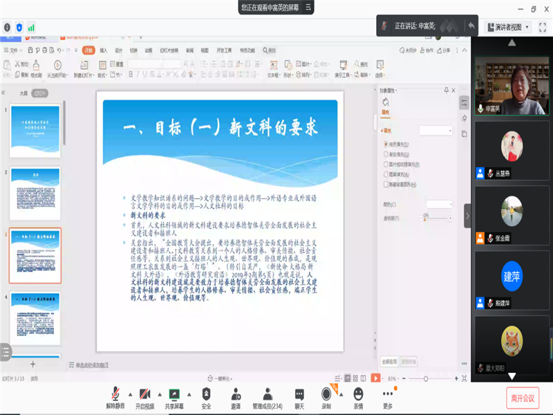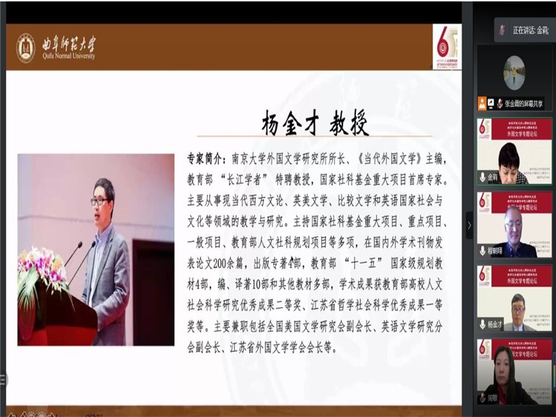 206外语论辩室隆重举行,并通过腾讯会议平台进行线上直播。该会议由秦洪武教授、金莉教授、季明举教授和张生珍教授进行主持,副校长夏云杰教授发表开幕致辞,杨金才教授、程朝翔教授、黄桂友教授、周敏教授、曹莉教授以及申富英教授就外国文学研究方面进行了精彩的汇报讲解。
