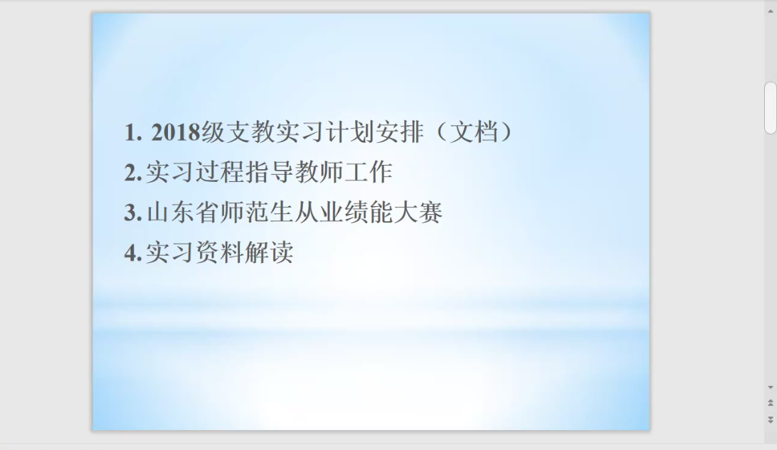 会议伊始,高歌老师阐述了实习支教的重要意义,并希望同学们能够珍惜支教机会,潜心教学,认真备课,不断提高自身教学业务水平,为将来的教师之路奠定坚实的基础。随后,高歌老师详细介绍了2018级支教实习计划安排、实习资料、实习过程中指导教师的工作内容以及山东省师范生从业技能大赛内容,并就实习支教期间可能遇到的问题作了梳理。同时,教育学生要学会沟通交流,正确处理个人与实习单位领导老师、学生家长和学生之间的关系。正值疫情期间,大家要切实增强安全防范意识,确保人身和财产安全。