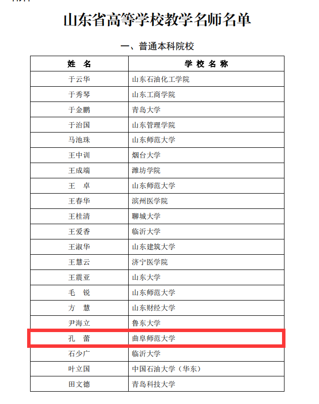 孔蕾教授荣获“2020年山东省高等学校教学名师”称号