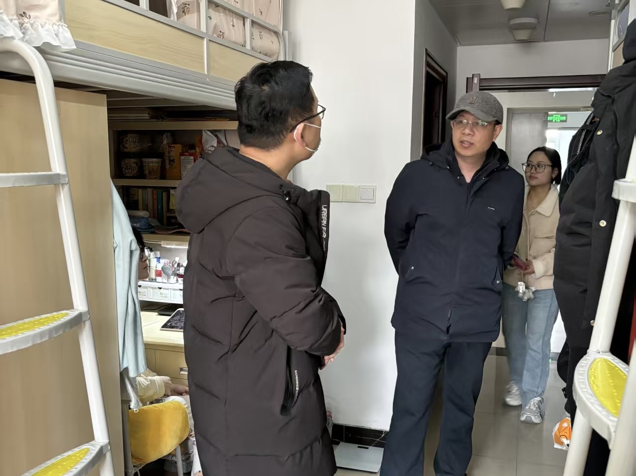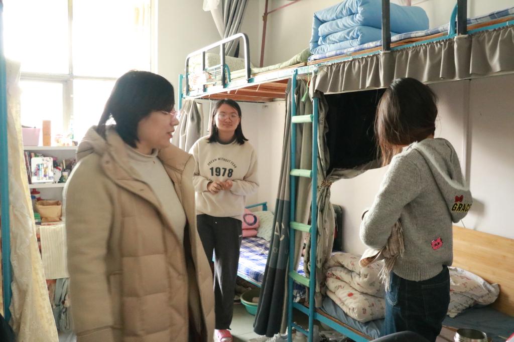 在深入教室过程中,学院领导仔细查看教室基础设施,排查安全隐患,观察学生及教师课堂状态,稳抓学风建设。在食堂走访过程中,走访队伍细致查看学生用餐环境与饮食保障情况,详细询问同学们对菜品种类、价格及营养搭配的满意度,叮嘱大家注意科学膳食,守护学生“舌尖上的安全”。随后,走访队伍走进学生宿舍,开展关怀慰问,重点查看寝室用电安全与生活便利性,针对宿舍卫生维护、电器使用规范及公共空间管理等实际问题给予指导。交流中,辅导员关切询问学生作息习惯与课余安排,鼓励大家以宿舍为“第二课堂”,在整洁有序的环境中涵养文明素养,于朝夕相处中锤炼协作精神,共同营造学风优良、和谐友爱的宿舍氛围。