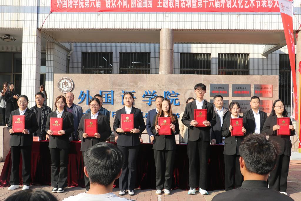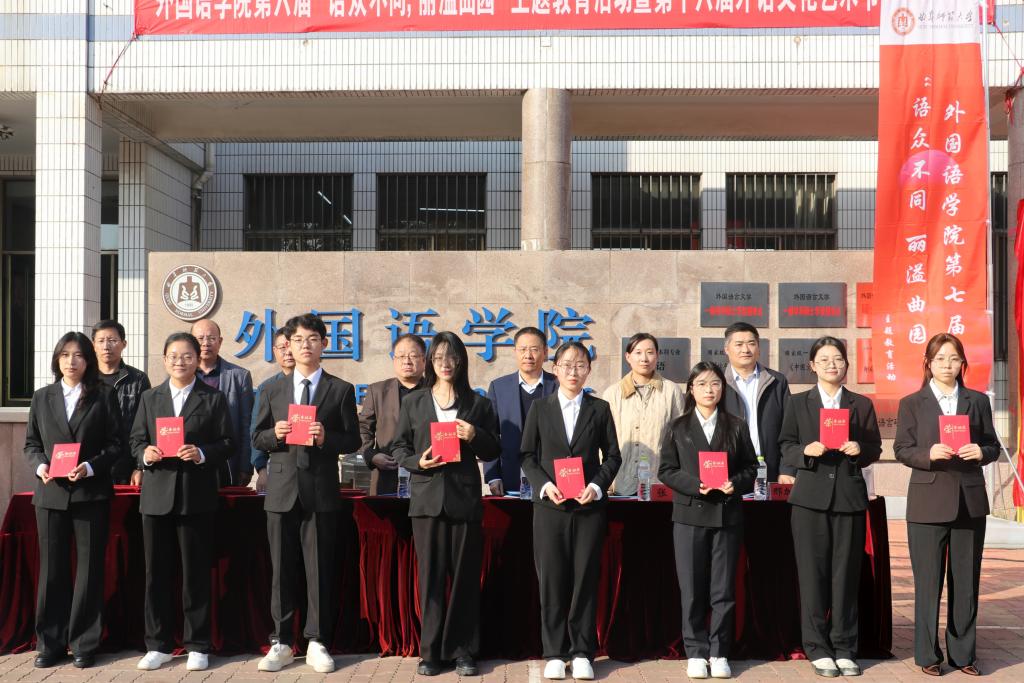 党委副书记王作茂在致辞中指出,本届活动恰逢学校70周年华诞,是传承校训精神、增强文化自信的重要载体。他鼓励外院学子通过活动提升外语能力与艺术素养,努力成长为符合时代要求的外语人才。随后,副院长王洪明宣读了第六届活动表彰方案及获奖名单,对优秀班主任、各级竞赛获奖者、十佳学子及先进集体等进行表彰,各位领导老师为获奖师生代表进行颁奖。紧接着,副院长邢加新介绍了第七届活动实施方案。本届活动设置思想引领、学风建设、语言交流、激情体育、集体文艺、技能拓展、科技创新和社团活动八大类内容,全面助力学生综合素质提升。