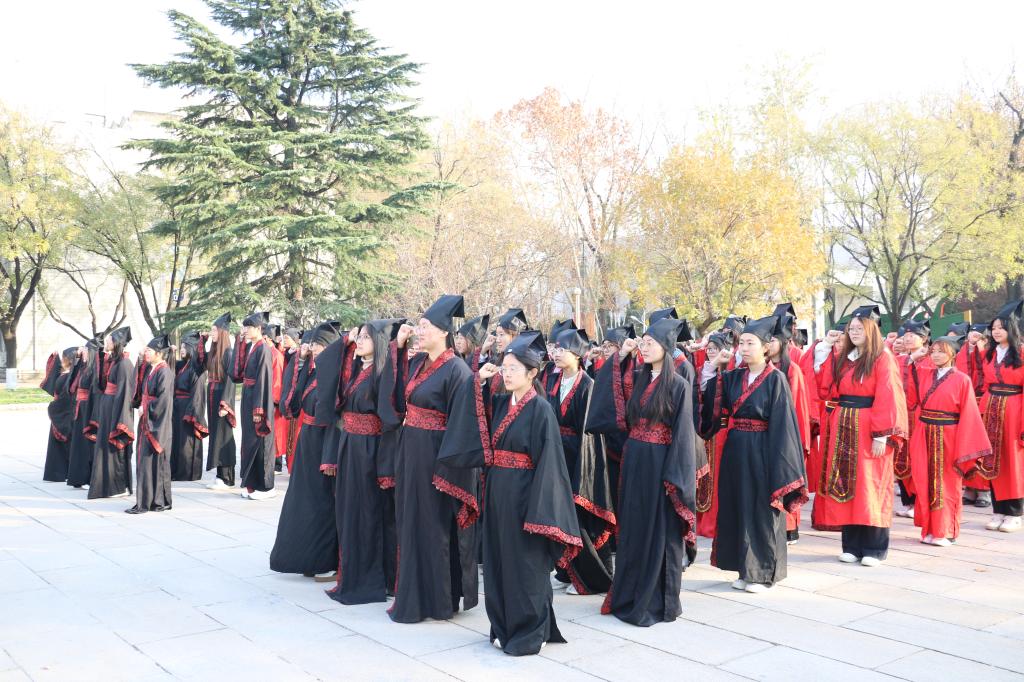 活动伊始,参礼学子身着礼服从容入场,行至孔子像前肃立,正衣冠、行礼仪。按照传统成人礼规制,由三位老师作为正宾为男生加冠、女生加笄,对他们跨入成人行列表示热烈祝贺和真诚祝福,学子们谦逊躬身,回应老师们的深切期待。随后,在学生代表于珂欣的带领下,全体参礼学子举起右拳庄严宣誓,承诺以“四有”公民为标尺,遵守法律法规、拥护党的领导,以求索真知、雕琢自我的态度,为国家发展与民族复兴不懈奋斗。活动最后,学子们向至圣先师孔子行揖礼,以致敬文脉、寄托初心。